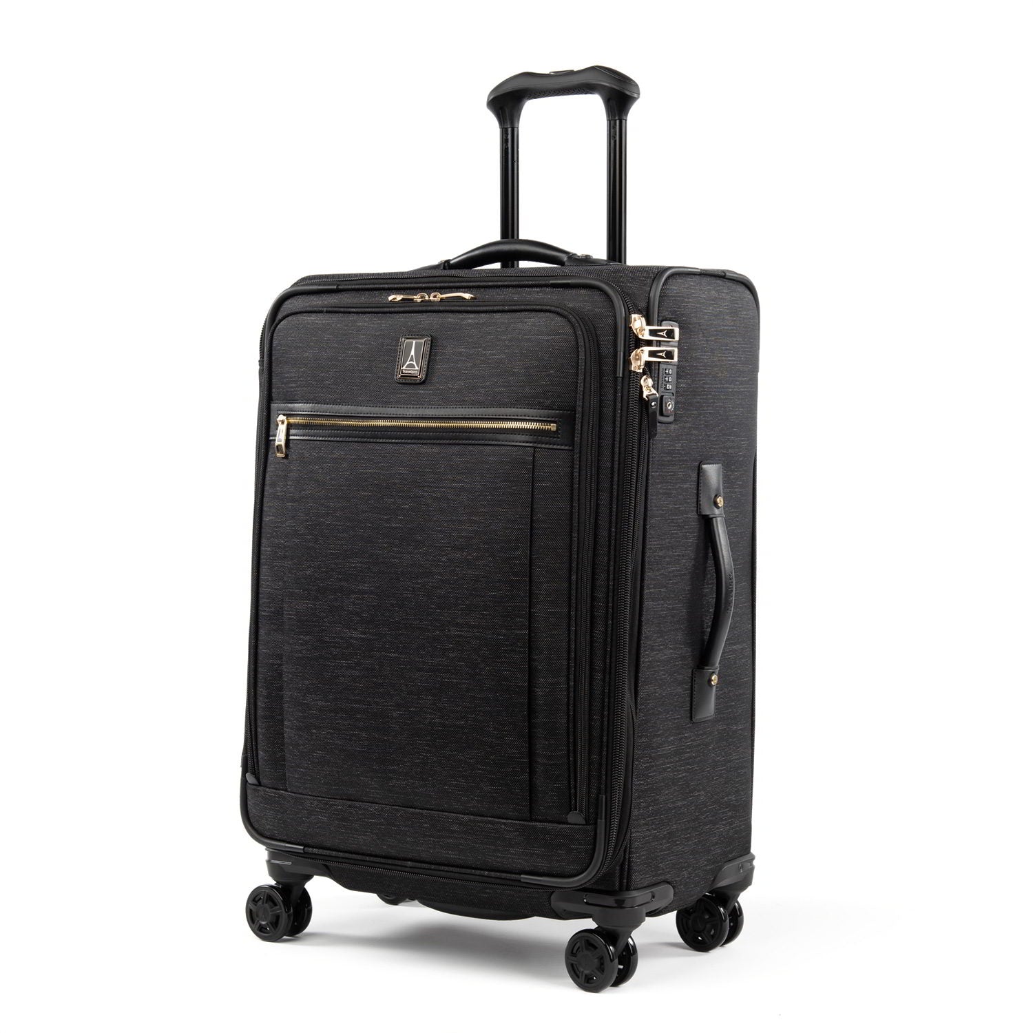Finally, great looking checked luggage that is as functional and durable as it is stylish. The Platinum® Elite 25” Expandable Spinner is perfect for medium and long trips, accommodating everything you need, guarding against wrinkles with a built-in suiter and keeping everything organized under a deluxe tie-down system with integrated accessory pockets. Constructed with premium fabrics, leather accents and chrome zippers, this gorgeous bag also features a tip-resistant tapered expansion option that provides up to 2” of additional packing capacity.